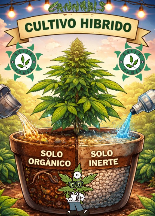 O cultivo híbrido, um sistema de solo orgânico e inerte juntos, como exemplo, é para growers que compraram um kit de cultivo da Green Power que inclui solo orgânico e querem aumentar a produtividade usando fertilizantes minerais como o sensi bloom da advanced nutrients, criando um sistema equilibrado entre vida microbiana e controle nutricional. Na prática, a planta utiliza dois caminhos: parte dos nutrientes vem da atividade biológica do substrato e outra parte é fornecida diretamente via fertirrigação, complementando em momentos estratégicos, principalmente quando a planta exige mais.